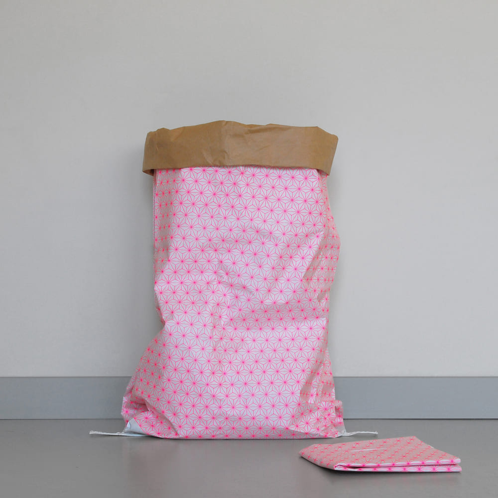 Η 100% οικολογική χάρτινη τσάντα είναι ίσως η πιο ιδιαίτερη από αυτή τη σειρά, καθώς είναι τυπωμένο ένα πολύ γνωστό παραδοσιακό ιαπωνικό σχέδιο, το μοτίβο asanoha που συμβολίζει τύχη και ευημερία. Μπορείτε ν’ αποθηκεύσετε όλα τα είδη των πραγμάτων, όπως παιχνίδια ή ρούχα κλπ., είναι ανθεκτική, επαναχρησιμοποιήσιμη πολλές φορές και βιοδιασπώμενη. Από διπλά ενισχυμένο χαρτί, μόλις τοποθετηθεί και του δώσετε σχήμα, η χάρτινη σακούλα μετατρέπεται σα γλυπτό στο χώρο σας, δίνοντας στυλ σε οποιοδήποτε δωμάτιο την τοποθετήσετε.